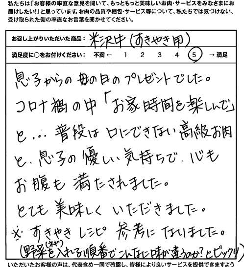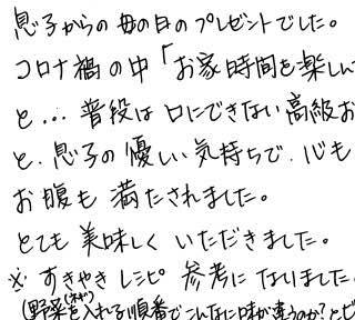 息子からの母の日のプレゼントでした。コロナ禍の中「お家時間を楽しんで」と…普段は口にできない高級お肉と、息子の優しい気持ちで、心もお腹も満たされました。とても美味しくいただきました。※すきやきレシピ参考になりました。(野菜(ネギ)を入れる順番でこんなに味が違うのか?とビックリ)