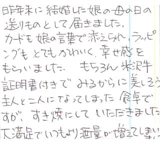 昨年末に結婚した娘の母の日の送りものとして届きました。カードも娘の言葉で添えられ、ラッピングもとてもかわいく、幸せ感をもらいました。もちろん米沢牛証明書付きで見るからに美しそう。主人と二人になってしまった食卓ですが、すき焼にしていただきました。大満足でいつもより酒量が増えてしまいました。ありがとー