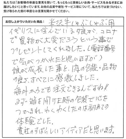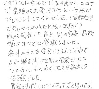 イギリスに住んでいる娘が、コロナで買い物が大変だろうという事でプレゼントしてくれました。娘が成長した事と、肉の包装・品物の良さすべてに感激しました。海外からでも注文できるんですね!まず箱を開けた時の放送で心をつかまれ、わくわくしたのは初めての体験でした。貴社のすばらしいアイディアだと思います。