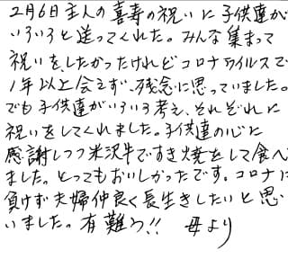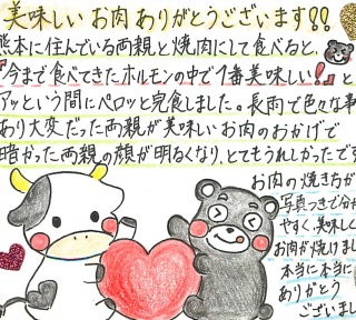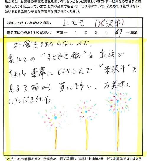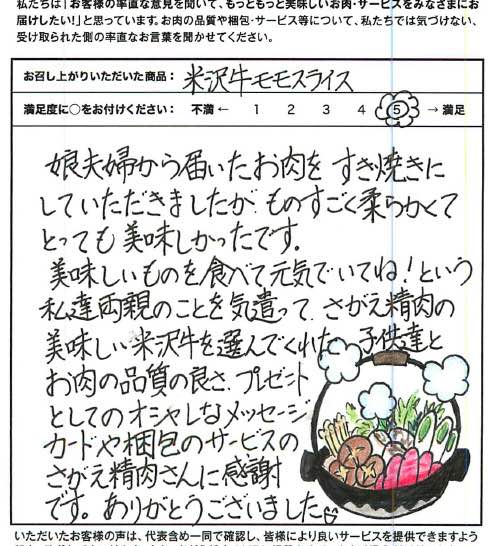 娘夫婦から届いたお肉をすき焼きにしていただきましたが、ものすごく柔らかくてとっても美味しかったです。美味しいものを食べて元気でいてね!という私達両親のことを気遣って、さがえ精肉の美味しい米沢牛を選んでくれた子供達とお肉の品質の良さ、プレゼントとしてのオシャレなメッセージカードや梱包のサービスのさがえ精肉さんに感謝です。ありがとうございました。