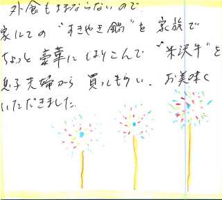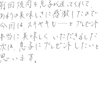 前回焼肉を息子が送ってくれて、あまりの美味しさに感激したので今回はスキヤキも…とプレゼント。本当に美味しくいただきました。次は、息子にプレゼントしたいと思います。