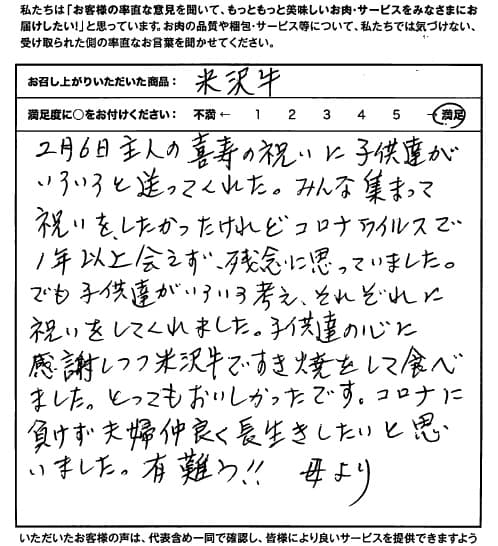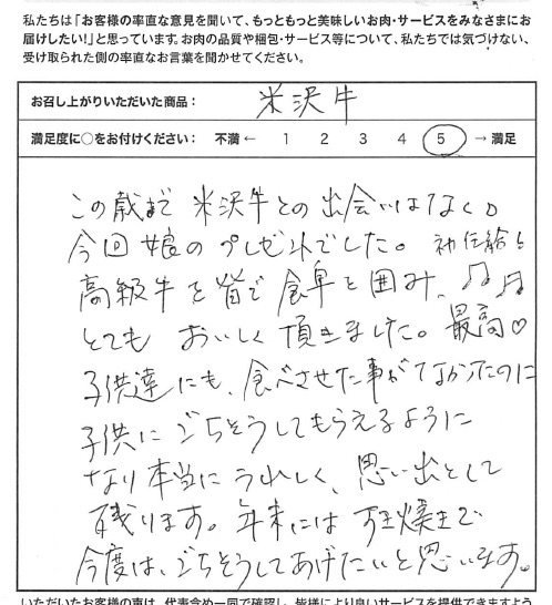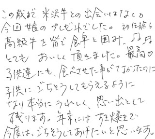 この歳まで米沢牛との出会いはなく。今回娘のプレゼントでした。初任給!高級牛を皆で食卓を囲み、とてもおいしく頂きました。最高!子供達にも食べさせた事がなかったのに、子供にごちそうしてもらえるようになり本当にうれしく、思い出として残ります。年末にはすき焼きで、今度はごちそうしてあげたいと思います。