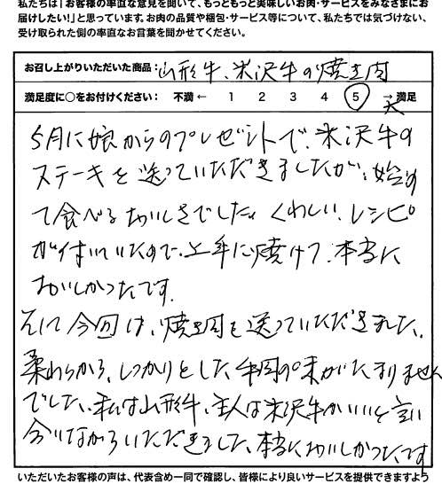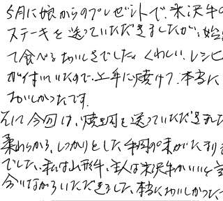 5月に娘からのプレゼントで米沢牛のステーキを送っていただきましたが、初めて食べる美味しさでした。くわしいレシピが付いていたので、上手に焼けて、本当に美味しかったです。そして今回は、焼肉を送っていただきました。柔らかく、しっかりとした牛肉の味がたまりませんでした。私は山形牛、主人は米沢牛がいいと言いながらいただきました。本当においしかったです。