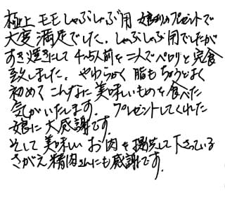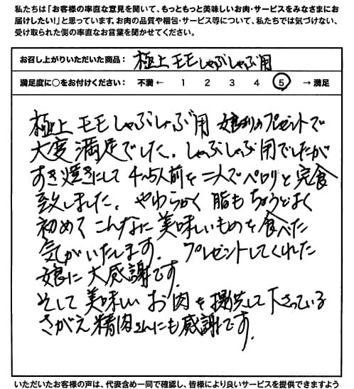 極上モモしゃぶしゃぶ用 娘よりのプレゼントで大変満足でした。しゃぶしゃぶ用でしたが、すき焼きにして4〜5人前を二人でペロリと完食致しました。やわらかく脂もちょうどよく初めてこんなに美味しいものを食べた気がいたします。プレゼントにしてくれた娘に大感謝です。 そして美味しいお肉を提供して下さっているさがえ精肉さんにも感謝です。