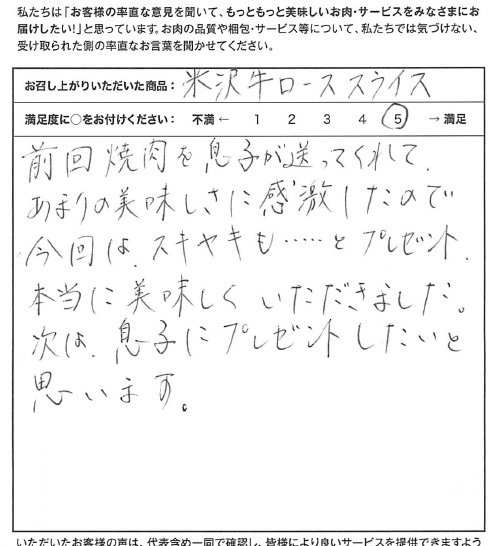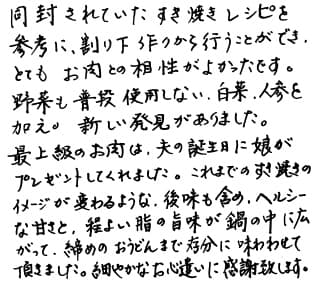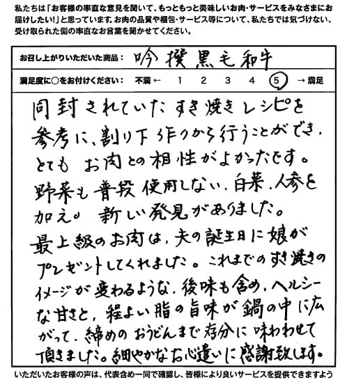 同封されていたすき焼きレシピを参考に、割り下作りから行うことができ、とてもお肉との相性がよかったです。野菜も普段使用しない、白菜、人参を加え、新しい発見がありました。最上級のお肉は、夫の誕生日に娘がプレゼントしてくれました。これまでのすき焼きのイメージが変わるような、後味も含め、ヘルシーな甘さと、程良い脂の旨味が鍋の中に広がって、締めのおうどんまで存分に味わわせて頂きました。細やかなお心遣いに感謝致します。