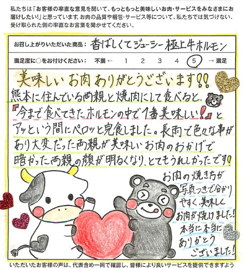 お客さまの声や口コミ・レビューをご紹介いたします。お寄せいただいた温かいお言葉を励みに、もっと、もっと、ご満足いただけるお肉をご提供できるよう努めてまいります。