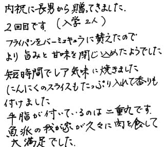 内祝に長男から贈ってきました。2回目です。(入学2人) フライパンをバーミュキュラに替えたのでより旨みと甘味を閉じ込めたようでした。短時間でレア気味に焼きました。にんにくのスライスもたっぷり入れて香りも付けました。牛脂が付いているのは二重丸です。魚派の我が家が久々に肉を食して大満足でした。