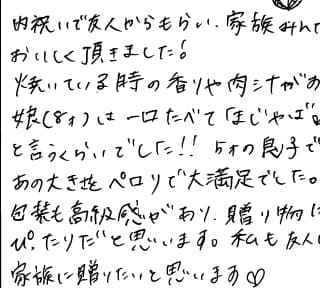 結婚内祝としていただきました。こんなにいい肉を食べたことのない母(92才)は、とても喜んでいました。レシピ等もあり、本当においしくいただきました。山形牛の産地証明書まで添付され安心していただくことができました。お祝を届けてくださった方と、「さがえ」様にありがとう♡