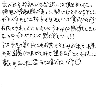 友人からお祝いのお返しに頂きました。 梱包が高級感があって、開けたときからテンションが上がりました! すきやきにして食べたのですが、お肉のやわらかさとさしのうまみに感動しました! 口の中でとけていく感じでした!! すきやきの割り下にもお肉のうまみが出て、お野菜やお豆腐に味がしみて翌日までとてもおいしくたのしめました! また食べたいです。