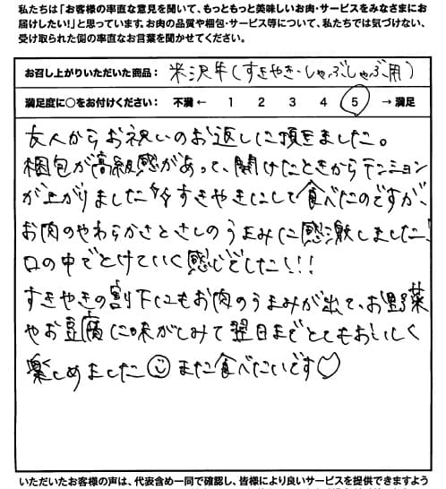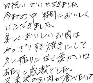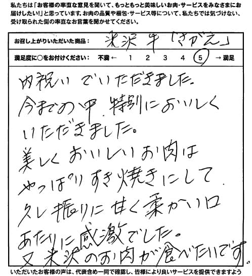 内祝いでいただきました。 今までの中、特別においしくいただきました。 美しくおいしいお肉はやっぱりすき焼きにして。 久し振りに甘く柔らかい口あたりに感激でした。 又米沢のお肉が食べたいです。