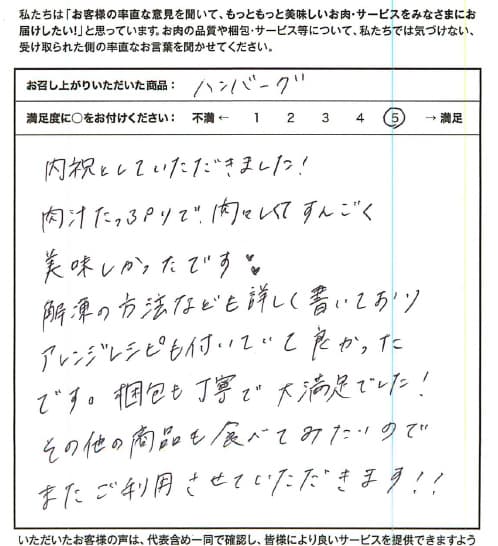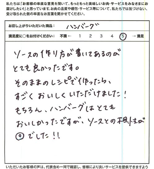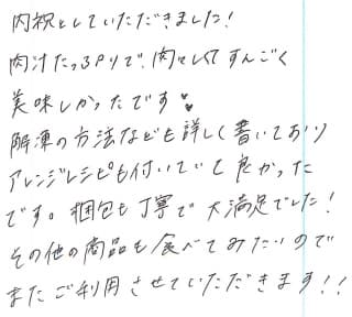 お客さまの声や口コミ・レビューをご紹介いたします。お寄せいただいた温かいお言葉を励みに、もっと、もっと、ご満足いただけるお肉をご提供できるよう努めてまいります。
