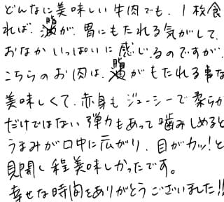 どんなに美味しい牛肉でも、1枚食べれば脂が胃にもたれる気がしておなかいっぱいに感じるのですが、こちらのお肉は脂がもたれる事なく美味しくて赤みもジューシーで柔らかいだけではない弾力もあって噛みしめるとうまみが口中に広がり、目がカッ!と見開く程美味しかったです。 幸せな時間をありがとうございました!!