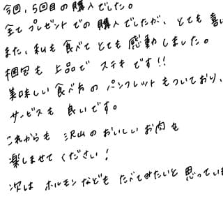 お客さまの声や口コミ・レビューをご紹介いたします。お寄せいただいた温かいお言葉を励みに、もっと、もっと、ご満足いただけるお肉をご提供できるよう努めてまいります。