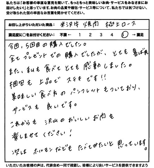 今回、5回目の購入でした。 全てプレゼントでの購入でしたが、とても喜ばれ、また、私も食べてとても感動しました。 梱包も上品でステキです!! 美味しい食べ方のパンフレットもついており、サービスも良いです。 これからも沢山のおいしいお肉を楽しませてください! 次はホルモンなどもたべてみたいと思っています。