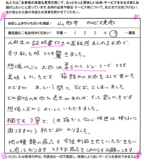 山形牛の証明書付きの高級感あふれるお肉で、受け取った時とても驚きました。 想像以上にお肉は柔らかくジューシーでとても美味しかったです。 箱詰めのお肉を2人で食べたのですが、あっという間になくなってしまいました。 どの部位のお肉か表示があれば、もっと楽しかったです。 想像しながらおいしくいただきました。 梱包も丁寧で、紙で助かりました。 他の種類の商品も今後利用させていただきたいと思っております。 これからもよろしくお願いします。