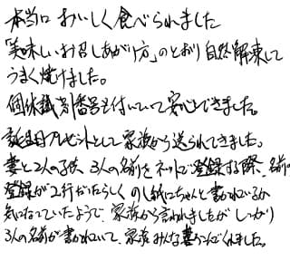 本当においしく食べられました。「美味しいお召しあがり方」のとおり自然解凍してうまく焼けました。 個体識別番号も付いていて安心できました。誕生日プレゼントとして家族から送られてきました。妻と2人の子供、3人の名前をネットで、登録する際、名前の登録が2行だったらしくのし紙にちゃんと書かれているか気になっていたようで、家族から言われましたがしっかり3人の名前が書かれていて、家族みんな喜んでくれました。