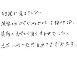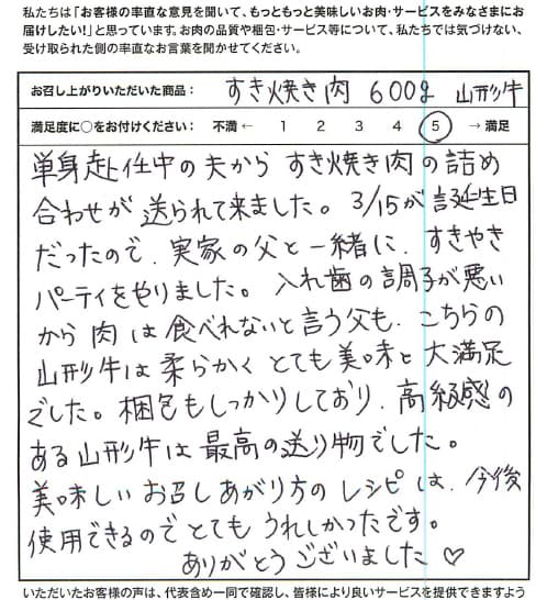 単身赴任中の夫からすき焼き肉の詰め合わせが送られて来ました。3/15が誕生日だったので、実家の父と一緒に、すきやきパーティーをやりました。入れ歯の調子が悪いから肉は食べれないと言う父も、こちらの山形牛は柔らかくとても美味と大満足でした。梱包もしっかりしており、高級感のある山形牛は最高の贈り物でした。美味しいお召しあがり方のレシピは、今後使用できるのでとてもうれしかったです。ありがとうございました♡