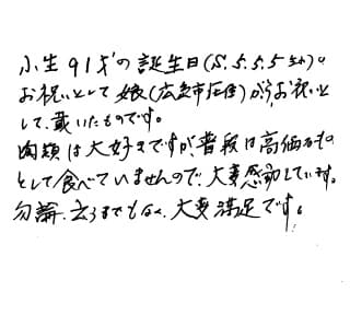 小生91才の誕生日(S.5.5.5生れ)のお祝いとして娘(広島市在住)から、お祝いとして、戴いたものです。 肉類は大好きですが、普段は高価なものとして食べていませんので、大変感動しています。勿論、云うまでもなく、大変満足です。