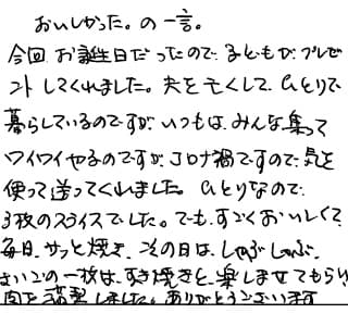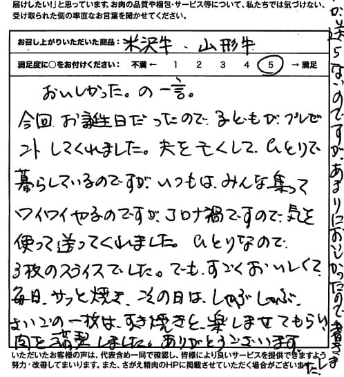 おいしかった。の一言。 今回お誕生日だったので、子どもがプレゼントしてくれました。夫を亡くして、ひとりで暮らしているのですが、いつもは、みんな集ってワイワイやるのですが、コロナ禍ですので、気を使って送ってくれました。ひとりなので、3枚のスライスでした。でも、すごくおいしくて、毎日、さっと焼き、次の日は、しゃぶしゃぶ、さいごの一枚は、すき焼きと、楽しませてもらい、肉を満喫しました。ありがとうございます。いつもは、意見なんか送らないのですが、あまりにおいしかったので書きました。