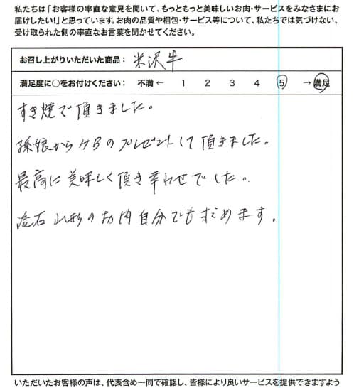 すき焼で頂きました。孫娘からHBのプレゼントとして頂きました。最高に美味しく頂き幸わせでした。流石山形のお肉、自分でも求めます。