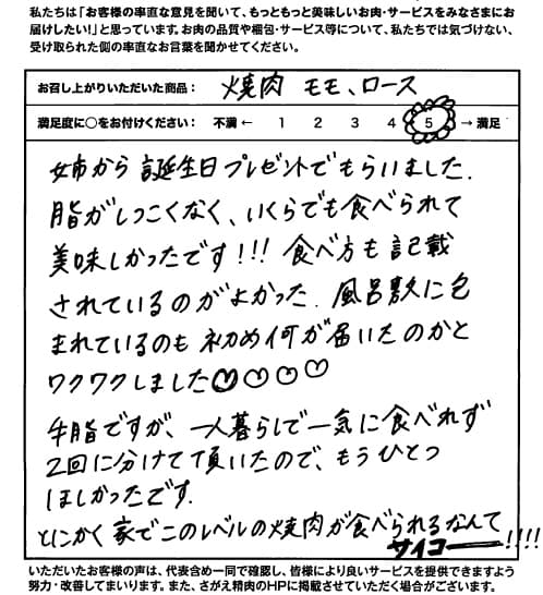 とても丁寧にラッピングもしてあり、お肉のお肉の情報も付けて頂いておりましたので安心して、お贈りすることができました。【山形牛/焼肉上モモ/誕生日プレゼント】