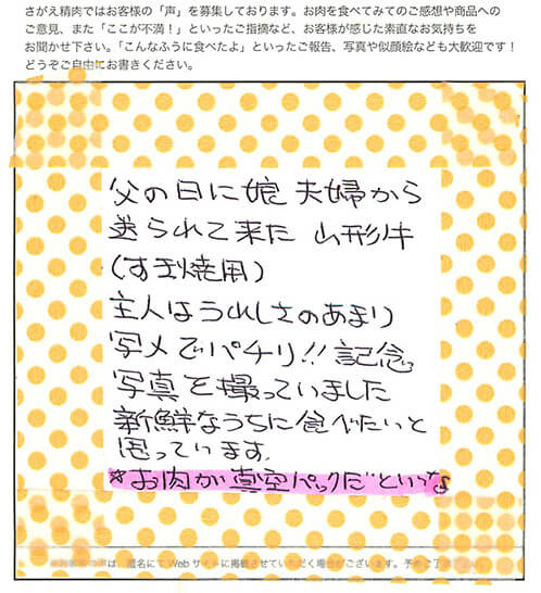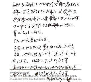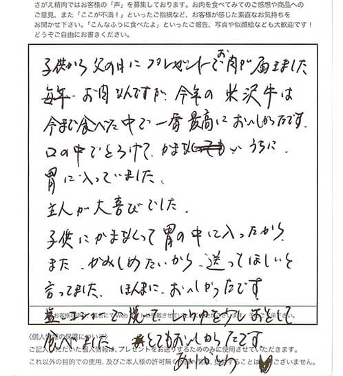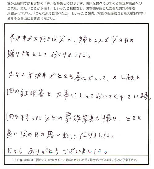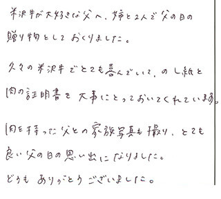 米沢牛が大好きな父へ、姉と2人で父の日の贈り物としておくりました。久々の米沢牛でとても喜んでいて、のし紙と肉の証明書を大事にとっておいてくれています。肉を持った父との家族写真も撮り、とても良い父の日の思い出になりました。どうもありがとうございました。