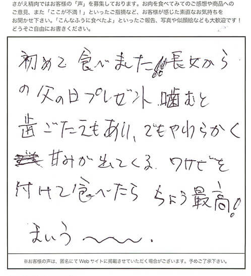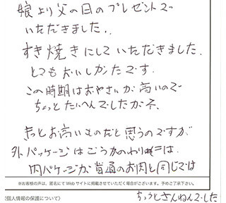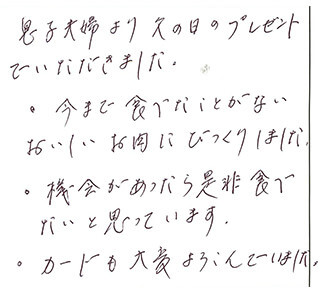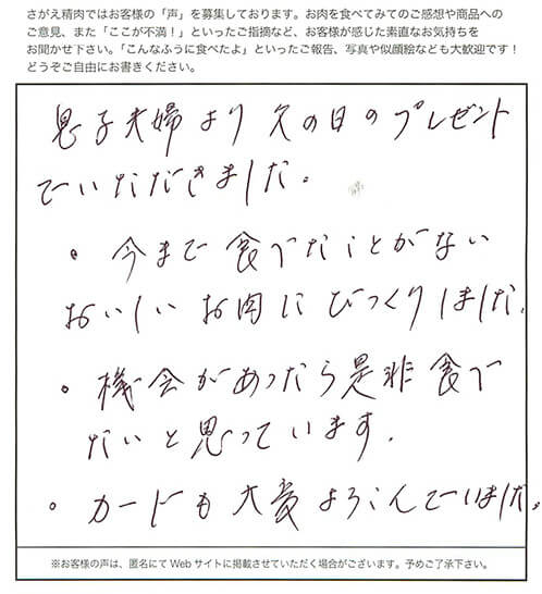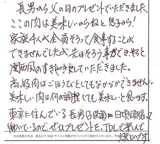 息子夫婦より父の日のプレゼントでいただきました。・今まで食べたことがないおいしいお肉にびっくりしました。・機会があったら是非食べたいと思っています。・カードも大変よろこんでいました。