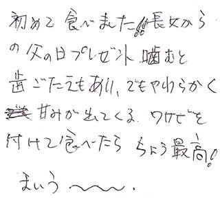 初めて食べました!!長女からの父の日プレゼント。噛むと歯ごたえもあり、でもやわらかく甘みが出てくる。ワサビを付けて食べたらちょう最高!まいう~〜〜。