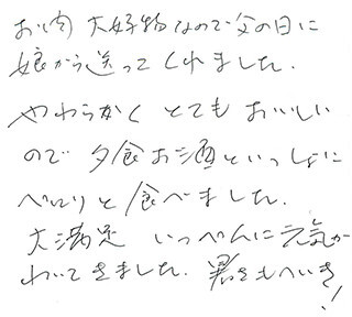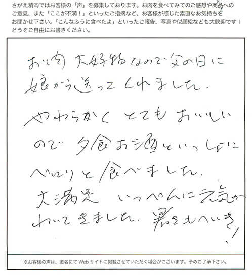 お肉大好物なので父の日に娘から送ってくれました。やわらかくとてもおいしいので夕食お酒といっしょにペロリと食べました。大満足 いっぺんに元気がわいてきました。暑さもへいき!
