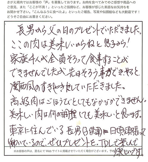 長男から父の日のプレゼントでいただきました。ここの肉は美味しいからねと息子から!家族4人が全員そろって食事することができませんでしたが、先日そろう事ができ、やっと、関西風のすきやきにしていただきました。高級肉はごほうびとしてもなかなかできません。美味しい肉は何の調理をしても美味しいと思います。東京に住んでいる長男(子供達)日頃頑張って働いているので、ぜひプレゼントを。TDLで楽しんで欲しいです。