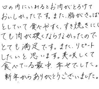 お客さまの声や口コミ・レビューをご紹介いたします。お寄せいただいた温かいお言葉を励みに、もっと、もっと、ご満足いただけるお肉をご提供できるよう努めてまいります。