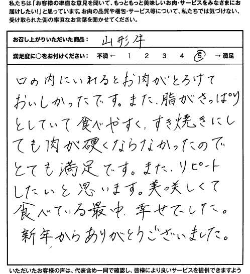 息子が通っている学校のクリスマスパーティでいただきました。 普段一人暮らしの祖母にも声をかけ、すき焼きで美味しくいただきました。 レシピが書いてあったので、それを参考にして焼くと、お肉も本当に柔らかく甘くて、家族みんなが「おいしい〜」と口にし、幸せな気分になりました。 ありがとうございました。 今回居なかった娘が帰省の折には、ぜひ「また食べさせてあげたいな〜」と思いました。 やっぱりすき焼きには米沢牛ですね