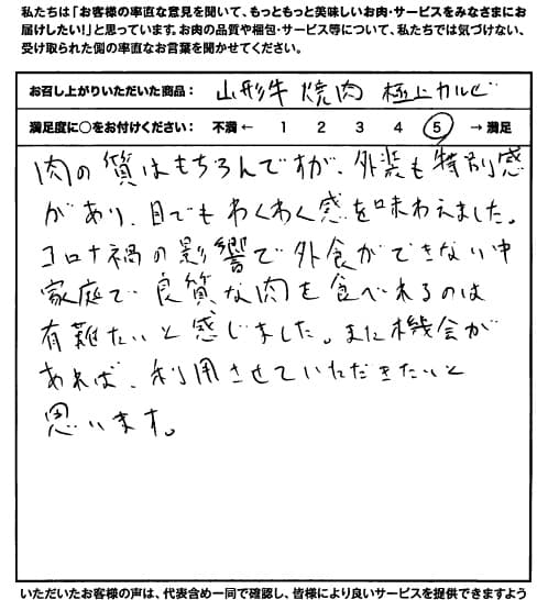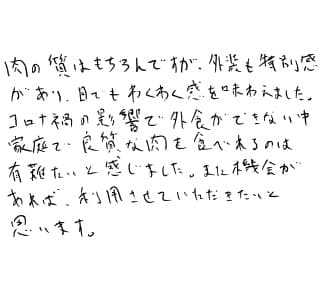 肉の質はもちろんですが、外装も特別感があり、目でもわくわく感を味わえました。コロナ禍の影響で外食ができない中家庭で良質な肉を食べれるのは有難たいと感じました。また機会があれば、利用させていただきたいと思います。