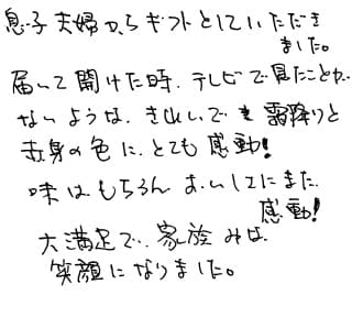 息子夫婦からギフトとしていただきました。届いて開けた時、テレビで見たことがないような、きれいで霜降りと赤身の色に、とても感動!味はもちろん、おいしさにまた、感動!大満足で、家族みな笑顔になりました。