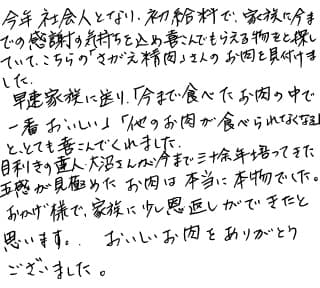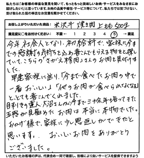 今年社会人となり、初給料で、家族に今までの感謝の気持ちを込め喜んでもらえる物をと探していて、こちらの「さがえ精肉」さんのお肉を見付けました。 早速家族に送り、「今まで食べたお肉の中で一番おいしい」「他のお肉が食べられなくなる」と、とても喜んでくれました。 目利きの達人・大沼さんが今まで三十余年培ってきた五感が見極めたお肉は本当に本物でした。おかげ様で、家族に少し恩返しができたと思います。おいしいお肉をありがとうございました。