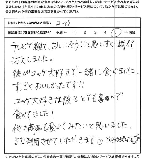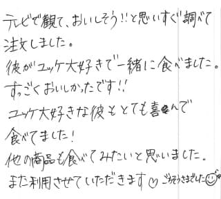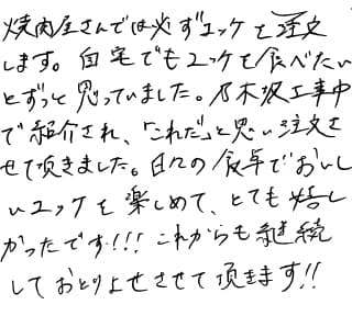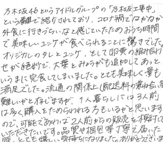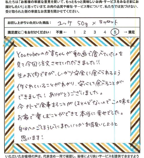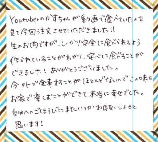 乃木坂46というアイドルグループの「乃木坂工事中」という番組で紹介されており、コロナ禍でなかなか外食に行きづらいなと感じていたためおうち時間で美味しいユッケが食べられることに驚きでした。オリジナルのタレとユッケ、そして卵黄の組み合わせが絶妙で、大葉とみょうがも追加してあっというまに完食してしまいました。とても美味しく、量も満足でした。流通の関係上(配送料の兼ね合い等)難しいかと存じますが、1人暮らしには3人前は多く、購入をためらわれる方もいるかと思いますので、可能であれば2人前からの販売を検討していただきたいです。品質や梱包等丁寧で届いた時、とても嬉しい気持ちになりました。ありがとうございました。