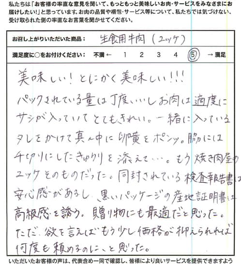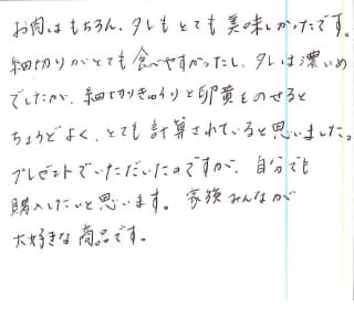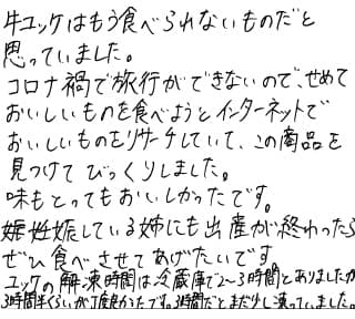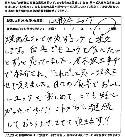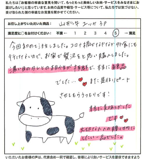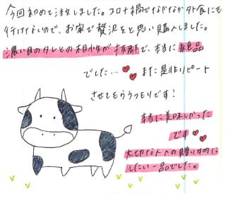 お客さまの声や口コミ・レビューをご紹介いたします。お寄せいただいた温かいお言葉を励みに、もっと、もっと、ご満足いただけるお肉をご提供できるよう努めてまいります。