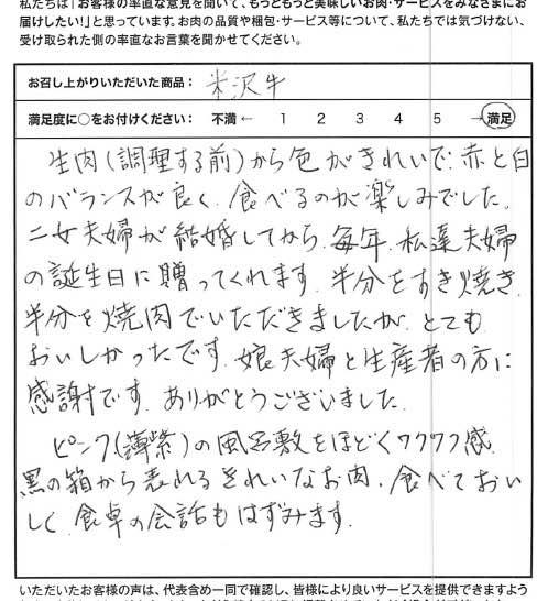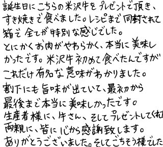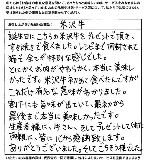 誕生日にこちらの米沢牛をプレゼントで頂き、すき焼きで食べました。レシピまで同封されて、箱で全てが特別な感じでした。とにかくお肉がやわらかく、本当に美味しかったです。米沢牛初めて食べたんですが、これだけ有名な意味がわかりました。割下にも旨味が出ていて、最初から最後まで本当に美味しかったです。生産者様に、牛さん、そしてプレゼントしてくれた両親に、皆に心から感謝致します。ありがとうございました。そしてごちそう様でした。