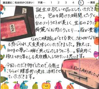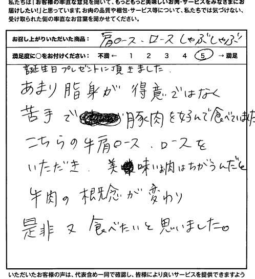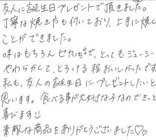 お客さまの声や口コミ・レビューをご紹介いたします。お寄せいただいた温かいお言葉を励みに、もっと、もっと、ご満足いただけるお肉をご提供できるよう努めてまいります。