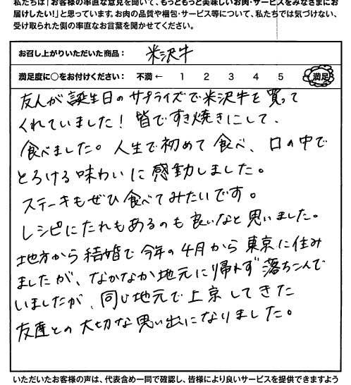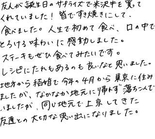友人が誕生日のサプライズで米沢牛を買ってくれていました!皆ですき焼きにして食べました。人生で初めて食べ、口の中でとろける味わいに感動しました。ステーキもぜひ食べてみたいです。レシピにたれもあるので良いなと思いました。地方から結婚で4月から東京に住みましたが、なかなか地元に帰れず落ち込んでいましたが、同じ地元で上京してきた友達との大切な思い出になりました。