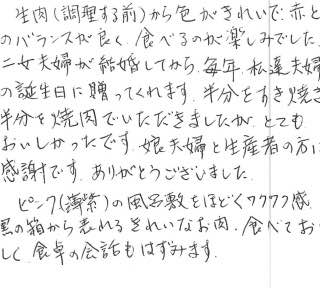 生肉(調理する前)から色がきれいで、赤と白のバランスが良く、食べるのが楽しみでした。二女夫婦が結婚してから毎年、私たち夫婦の誕生日に贈ってくれます。半分をすき焼き、半分を焼肉でいただきましたが、とても美味しかったです。娘夫婦と生産者の方に感謝です。ありがとうございました。ピンク(薄紫)の風呂敷をほどくワクワク感、黒い箱から現れるきれいなお肉、食べて美味しく、食卓の会話もはずみます