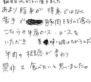 誕生日プレゼントに頂きました。あまり脂身が得意ではなく苦手で、豚肉を好んで食べていました。こちらの牛肩ロース、ロースをいただき、美味しいお肉は違うんだと牛肉の概念が変わり、是非又食べたいと思いました。