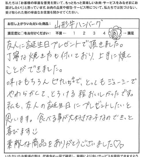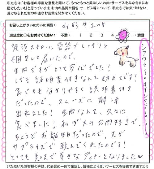 今回、誕生日プレゼントに頂きました。 肉好きの私ですが、山形牛を口にしたのは初めてでしたが、クラっとくるお肉で口当たりも滑らか。そして柔らかくてお肉の味を堪能することが出来ました。 九州に住んでいることもあり、佐賀牛を食することがありますが、ベスト1になるほどの美味しさでした。これからも注目していきます。
