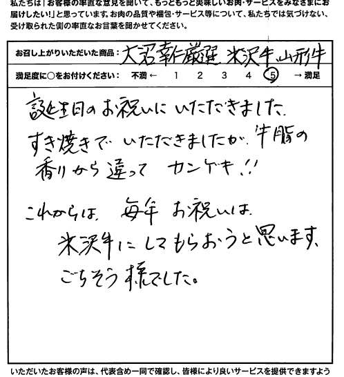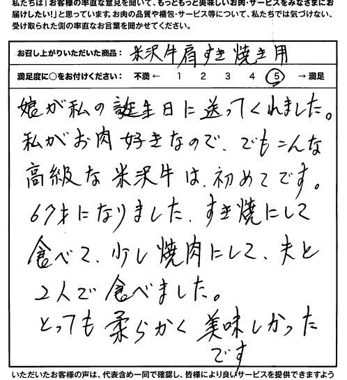 誕生日のお祝いにいただきました。すき焼きでいただきましたが、牛脂の香りから違ってカンゲキ!!これからは毎年お祝いは米沢牛にしてもらおうと思います。ごちそう様でした。