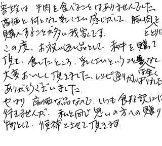 お客さまの声や口コミ・レビューをご紹介いたします。お寄せいただいた温かいお言葉を励みに、もっと、もっと、ご満足いただけるお肉をご提供できるよう努めてまいります。