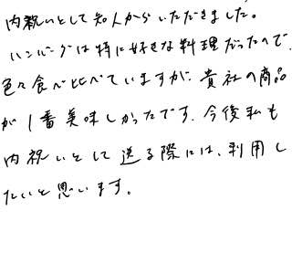 お世話様です。息子の卒業いわい(入学いわい)のお礼返しとして、親せきに使わせていただきました。だれからも好評で、「とてもおいしかった!」と伝説のようにずっと何回もお礼を言われるほど、喜んでもらえて、本当にさがえ精肉さんにお願いしてよかったと心から思い、感謝いたしております。夫と2人でも、すきやきをいただきましたが、やわらかく、甘み、うまみがあり、最高でした。また、いつかおとりよせして食べたいです。お得な切りおとしなど、とても嬉しいのでふやしてほしいです。