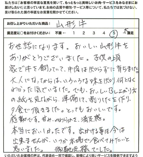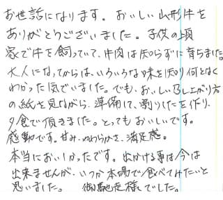 お世話になります。おいしい山形牛をありがとうございました。子供の頃家で牛を飼っていて、牛肉は知らずに育ちました。大人になってからは、いろいろな味を知り何となくわかった気でいました。でも、おいしい召し上がり方の紙を見ながら準備して、割りしたを作り、夕食で頂きました。とってもおいしいです。感動です。甘み、やわらかさ、満足感。本当においしかったです。出かける事は今は出来ませんが、いつか本場で食べてみたいと思いました。御馳走様でした。
