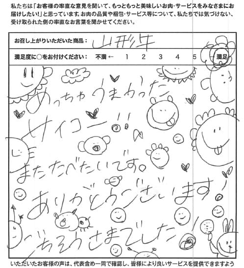 お客さまの声や口コミ・レビューをご紹介いたします。お寄せいただいた温かいお言葉を励みに、もっと、もっと、ご満足いただけるお肉をご提供できるよう努めてまいります。