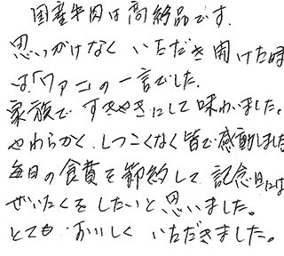 拝啓、この度は本当にありがとうございました。 今回、大学2年生の息子から初めて父の日と誕生日のお祝いとのことで貴社のお肉をプレゼントにていただきました。 彼が生まれて初めて、父である私にプレゼントしてくれたお肉が貴社の「米沢牛・山形牛の証」であること・・・。 この事実をどのように受け止めればよいのか? 貴社のお肉は何ゆえに息子の選択を受けたのか? 考えても答えはありませんが、きっと貴社の何かが息子の心を射止めたのだと思います。 その裏返しが息子の気持ちであるのだと思います。 一人息子が札幌から弘前市で一人暮らしを行い、アルバイトしたお金で、彼にとってはじめての私へのプレゼントが貴社製品であったことは、私にとって感慨深くとてもうれしいこととなりました。 とても嬉しく涙をぬぐいながら食べさせていただきました。 貴社ますますのご繁栄をお祈りいたします。 敬具
