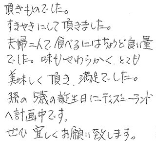 頂きものでした。 すきやきにして頂きました。 夫婦二人で食べるにはちょうど良い量でした。味もやわらかく、とても美味しく頂き、満足でした。 孫の5歳の誕生日にディズニーランドへ計画中です。 ぜひ宜しくお願い致します。